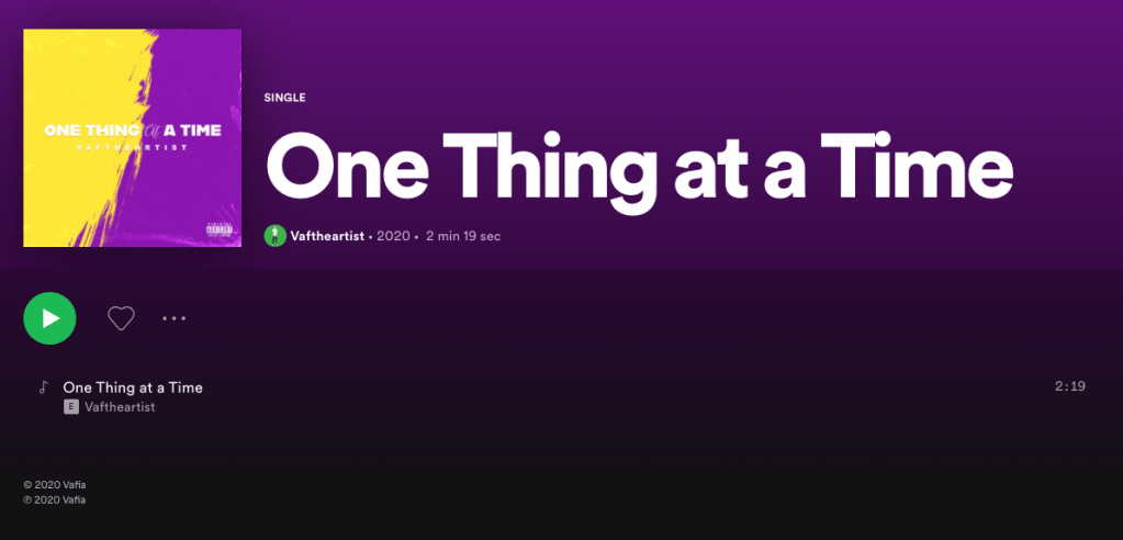 Posted on July 25, 2020 by musicrockchannelOne Thing at a Time by Vaftheartist ⭐⭐⭐⭐⭐ Rating: 5 out of 5. 17 year old hip hop / Rnb artist from California Instagram is @vaftheartist Share this: Click to share on X (Opens in new window) X Click to share on Facebook (Opens in new window) Facebook Like Loading...
